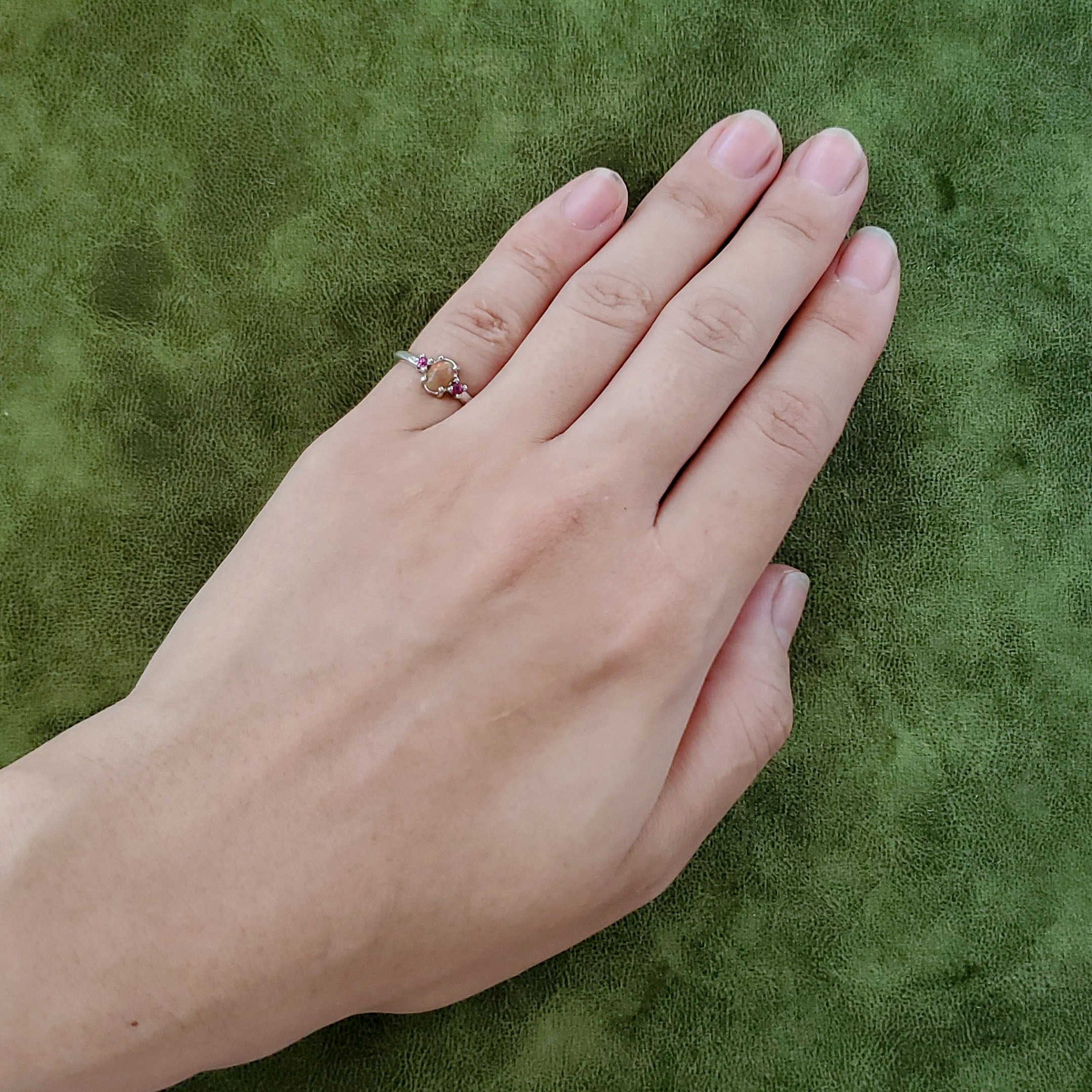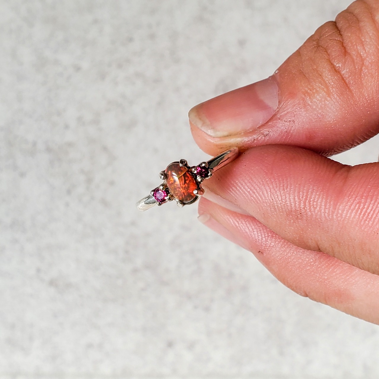 夕焼けのようなブラックオパールと、ルビーを組み合わせたSilver925のリングです。
