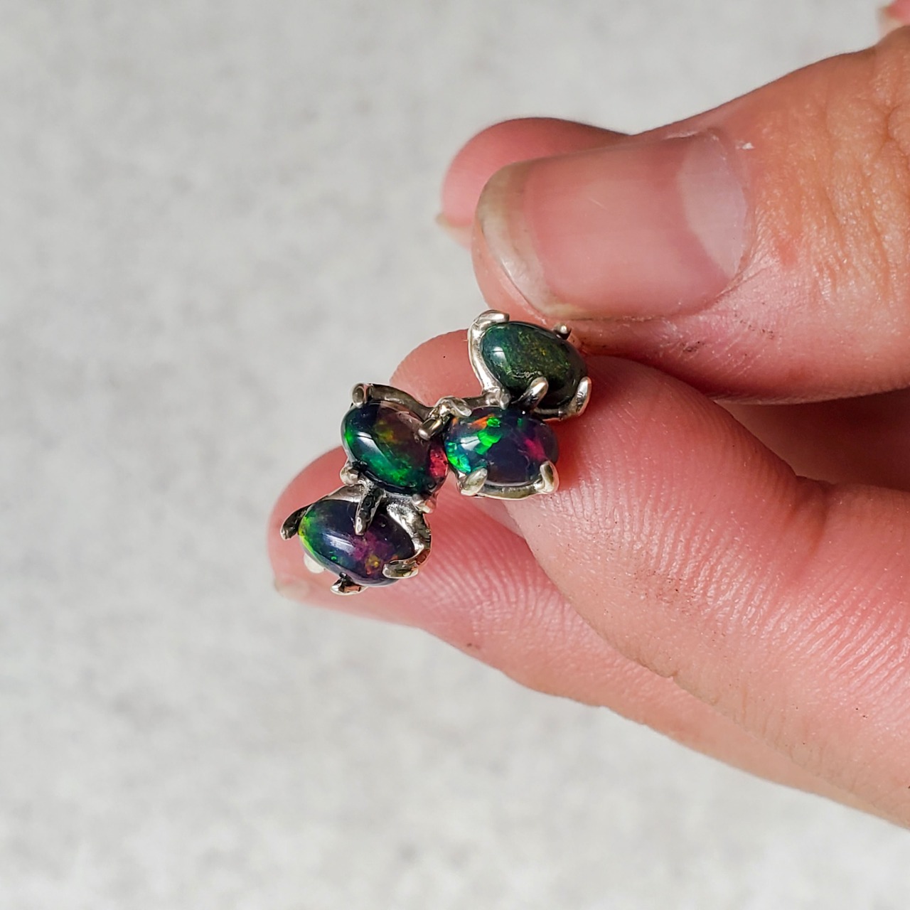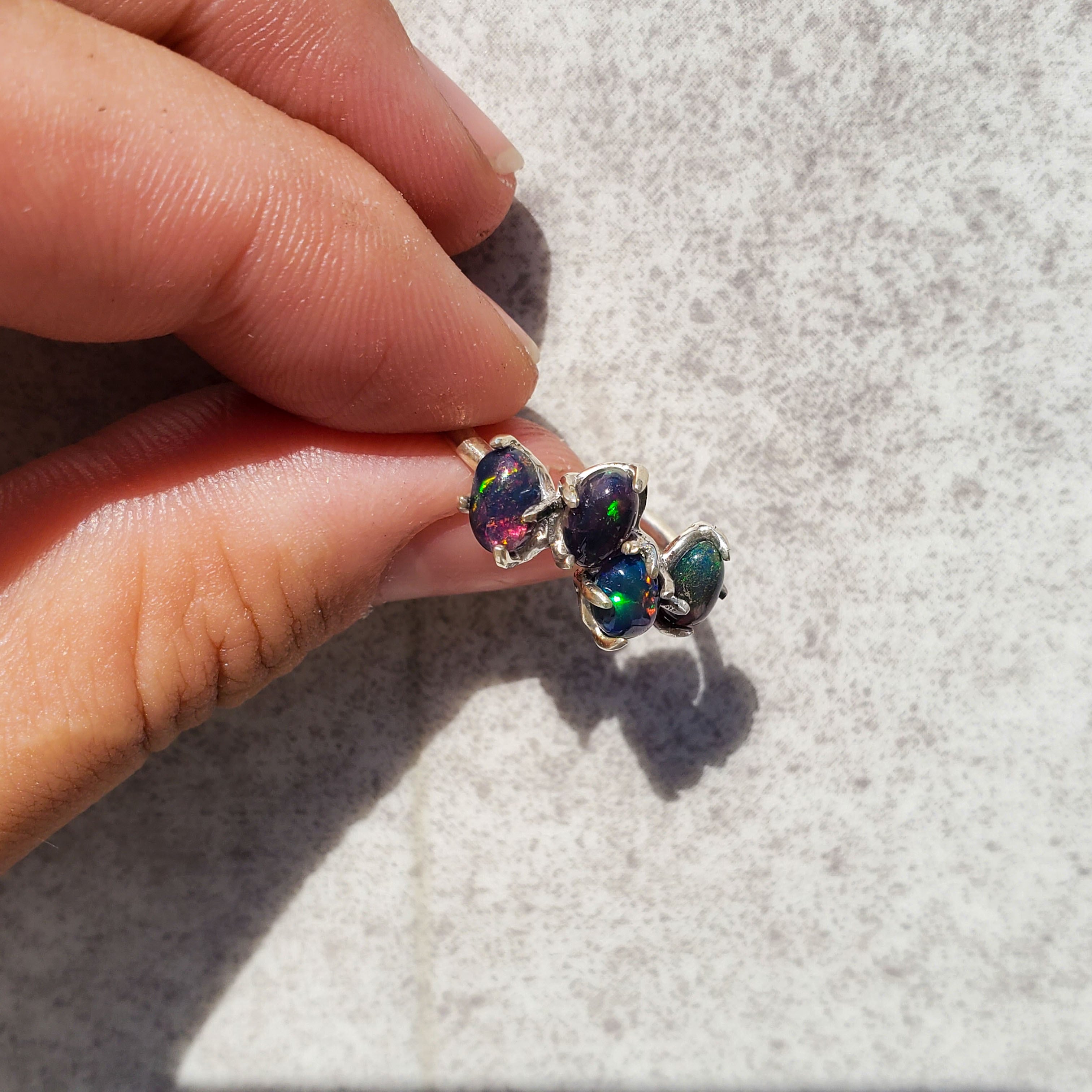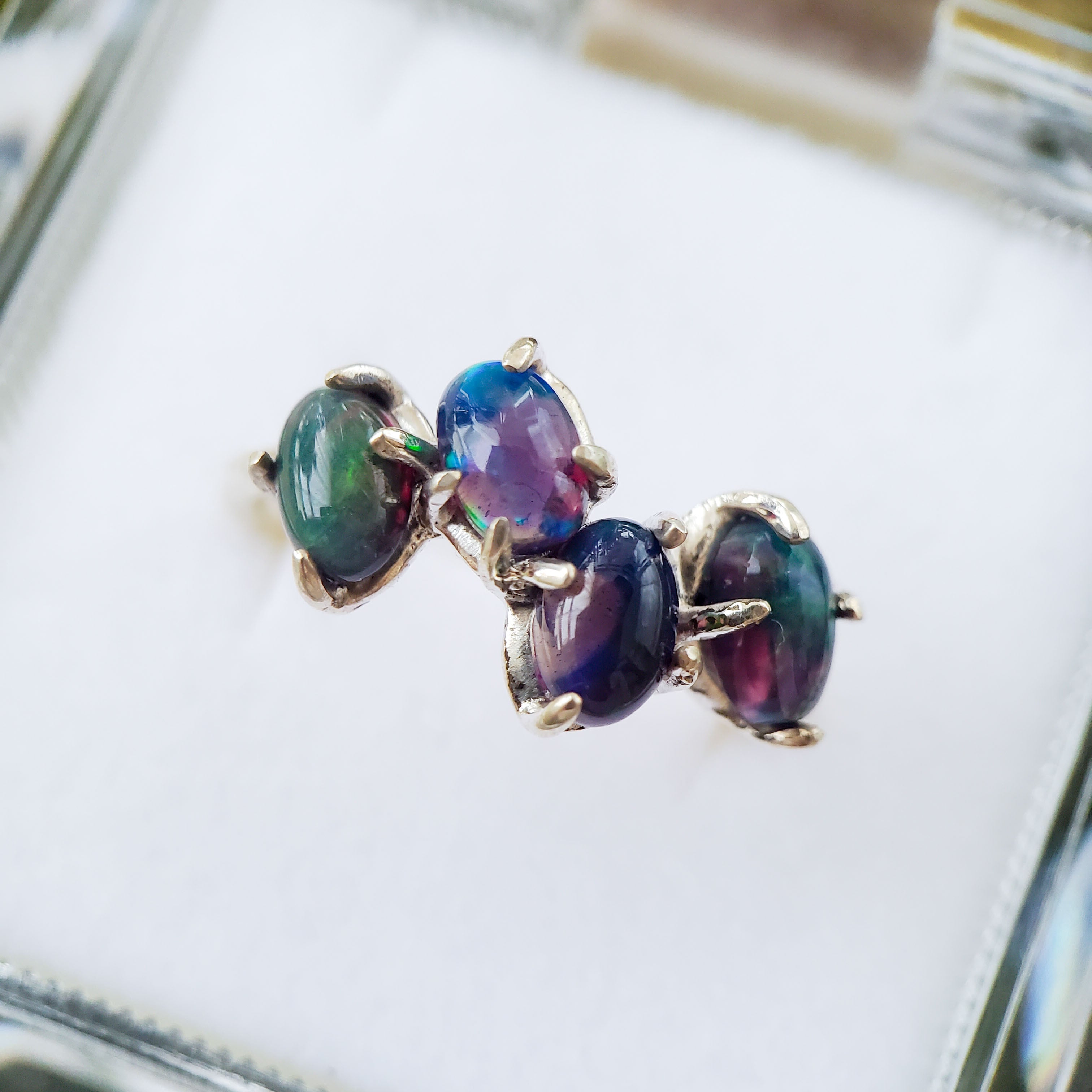 角度によって青や緑、紫など多彩な輝きを見せるオパールは、まるで小さな宇宙を指先に宿すよう。