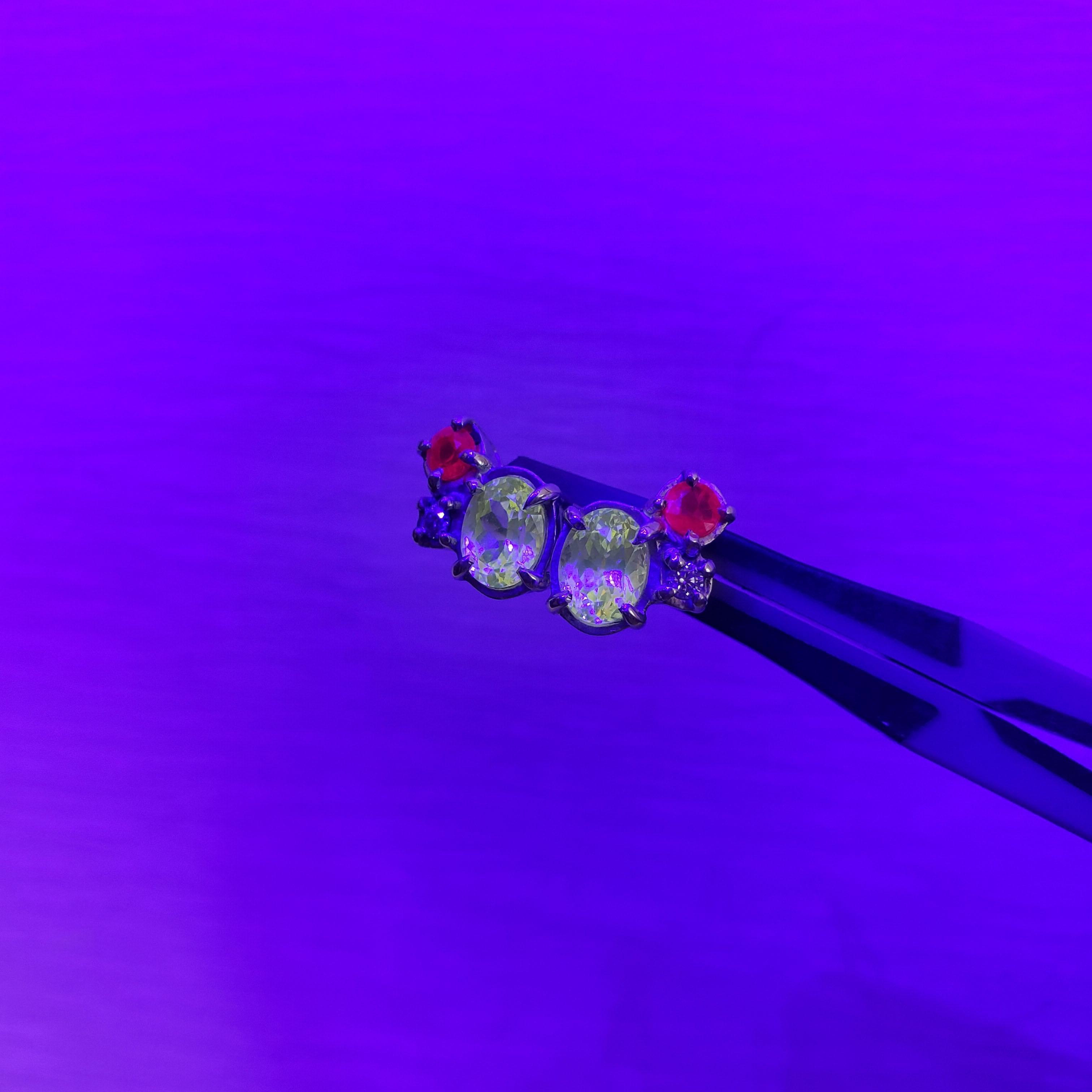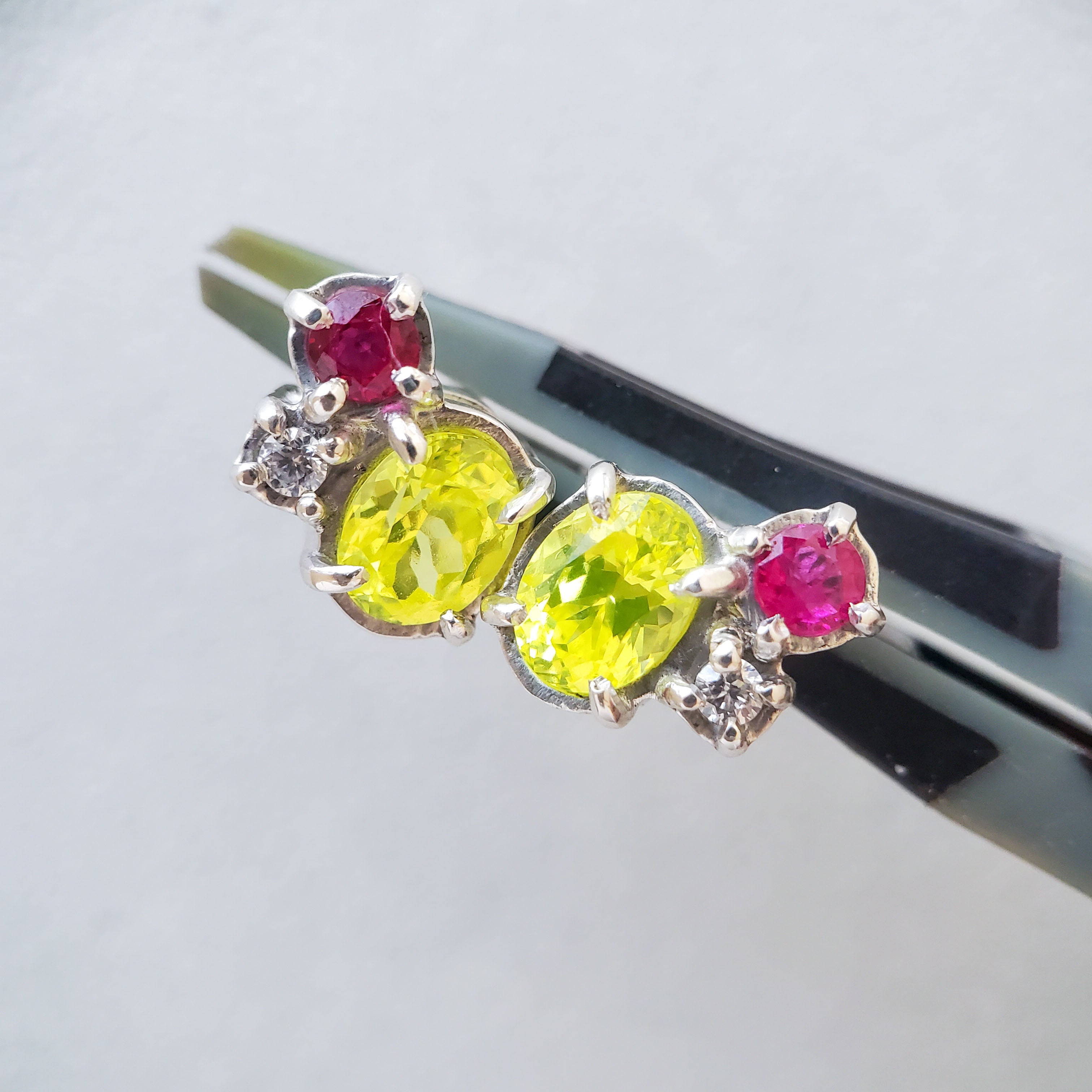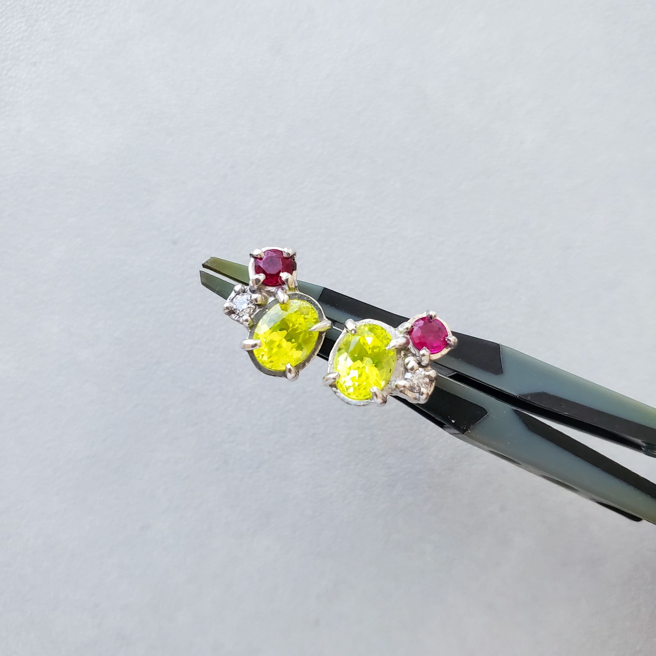 鮮やかな色彩が目を覚ますような、YAG・ルビー・モアサナイトのピアス。