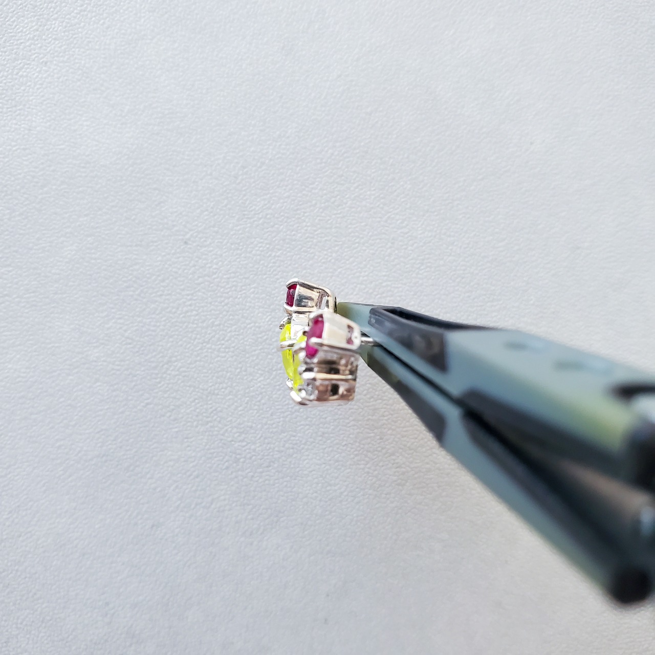太陽の光を閉じ込めたようなライムイエローのYAGに、ルビーの赤とモアサナイトの透明なきらめきが寄り添います。