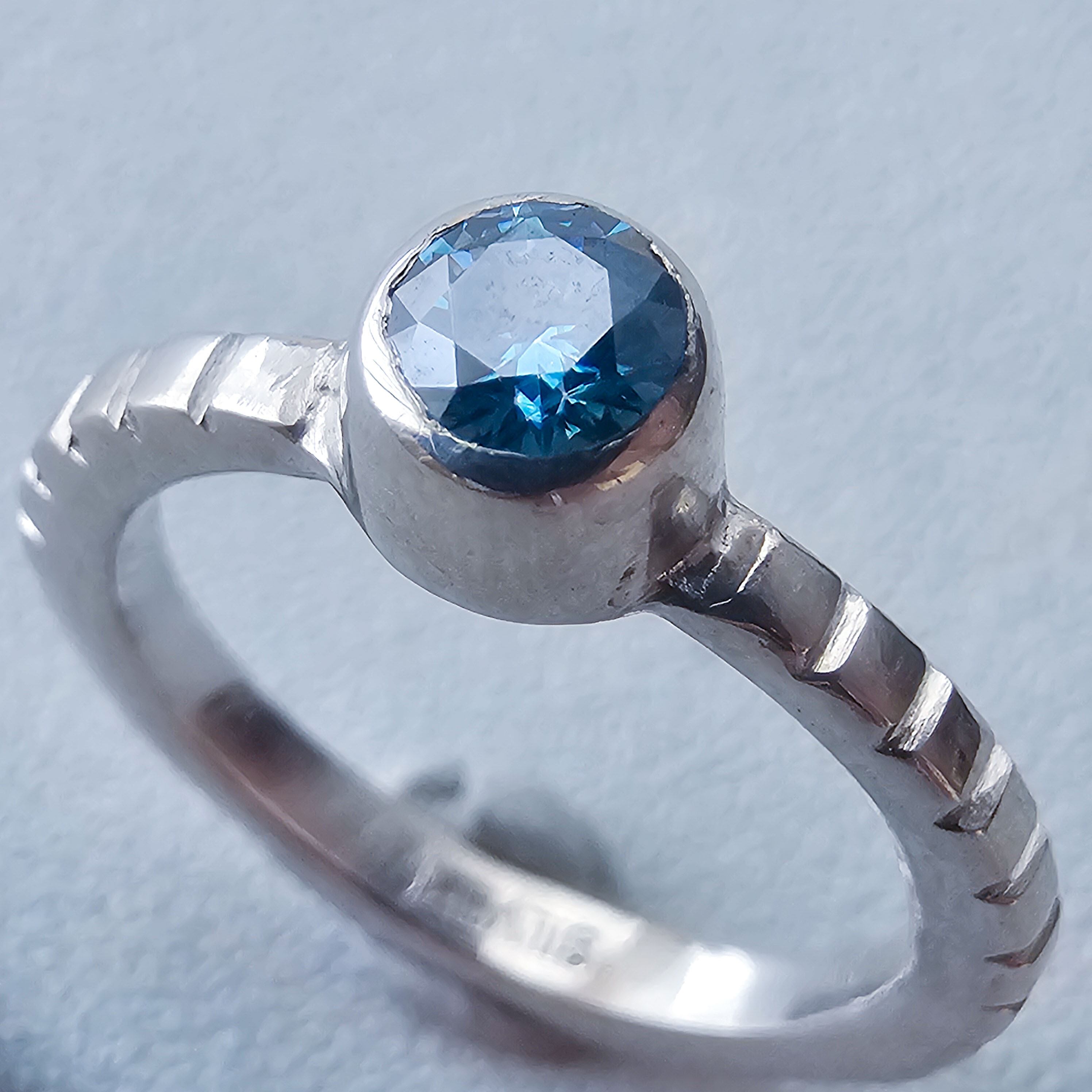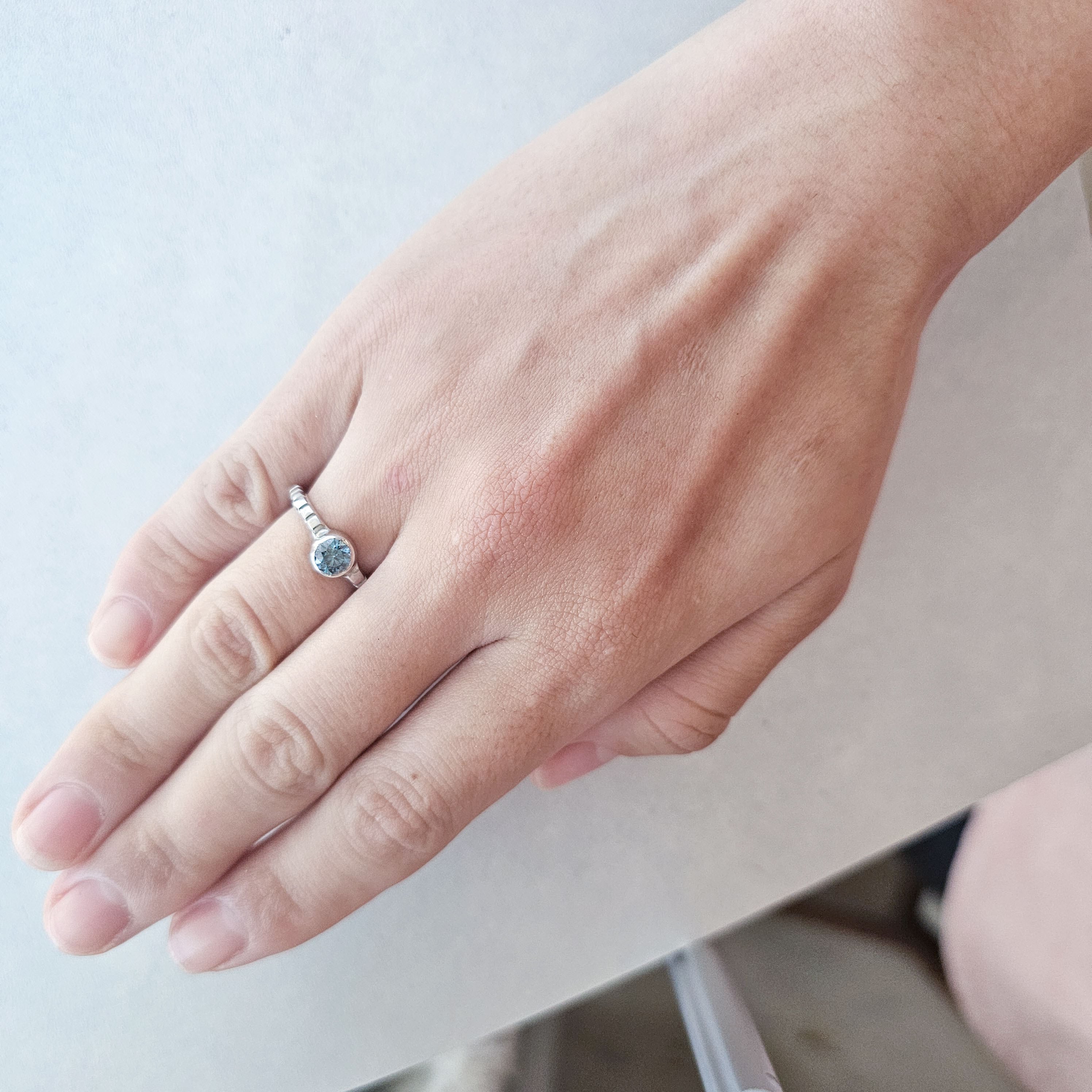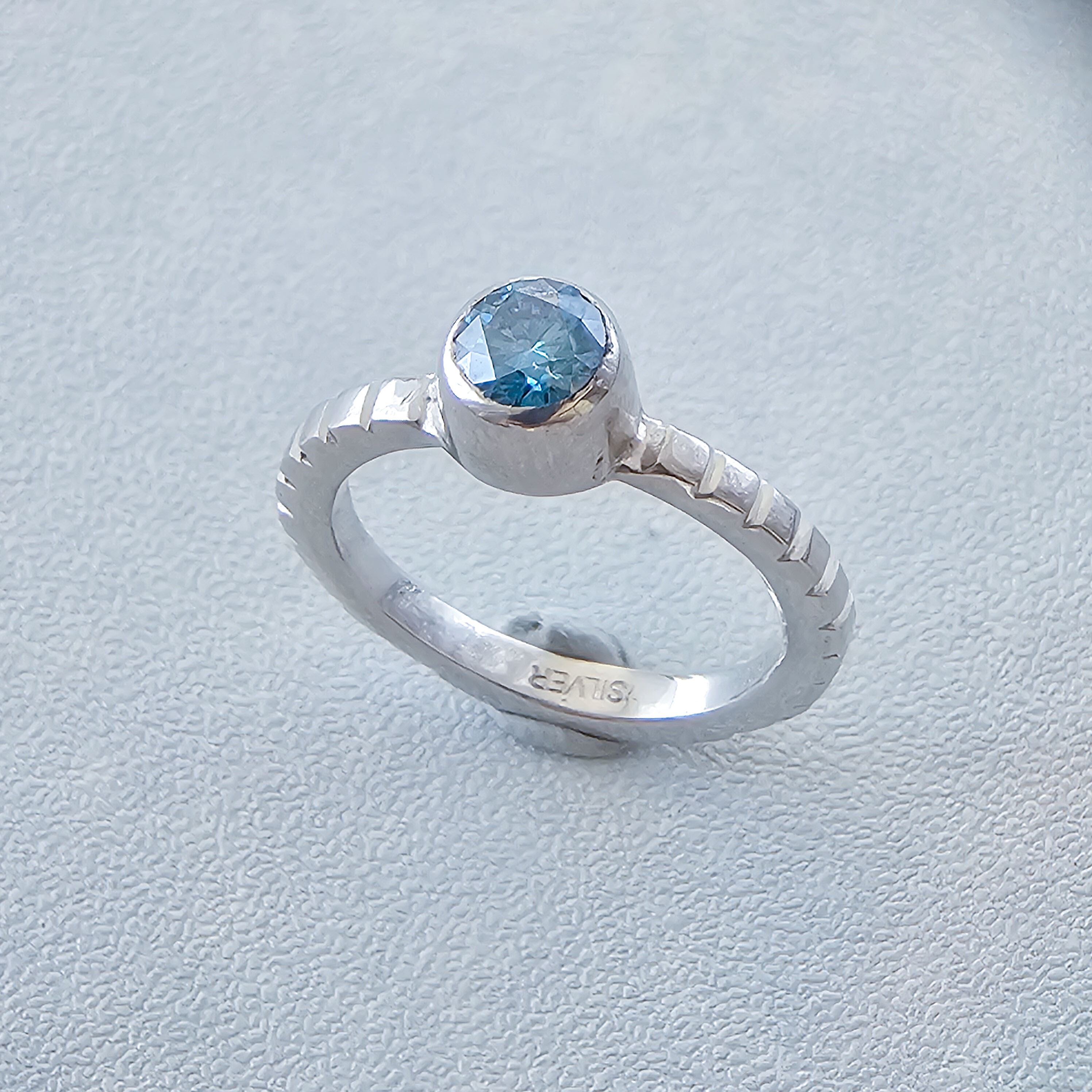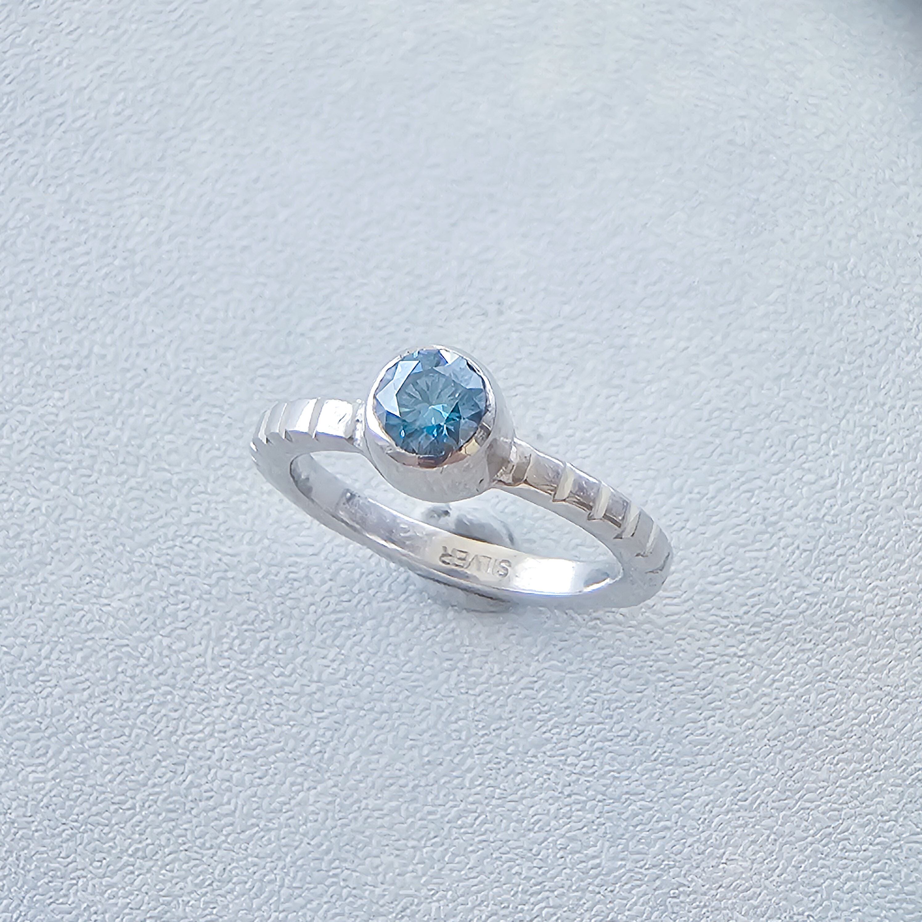 ブルーのモアサナイトは光の角度によって表情が変わり、