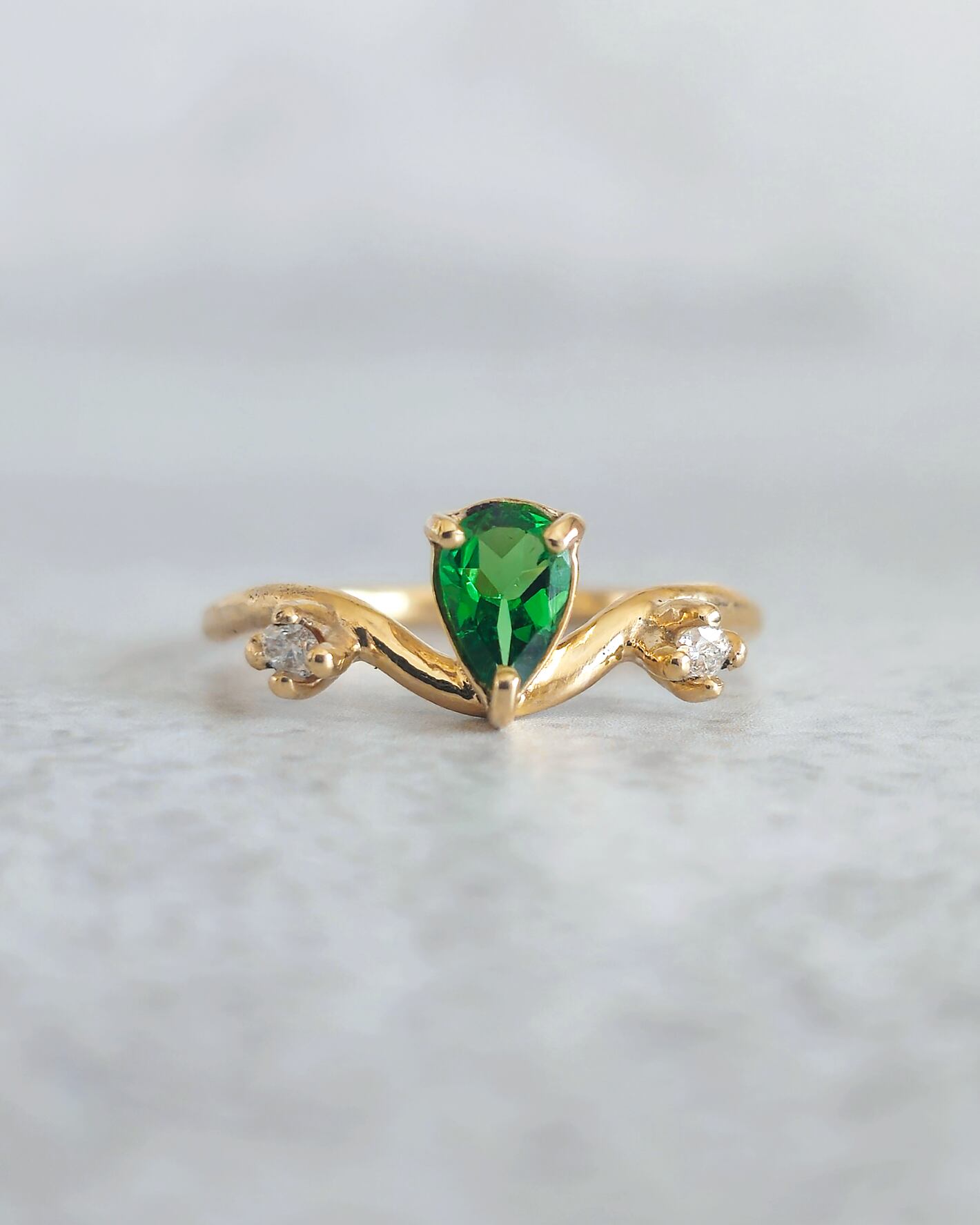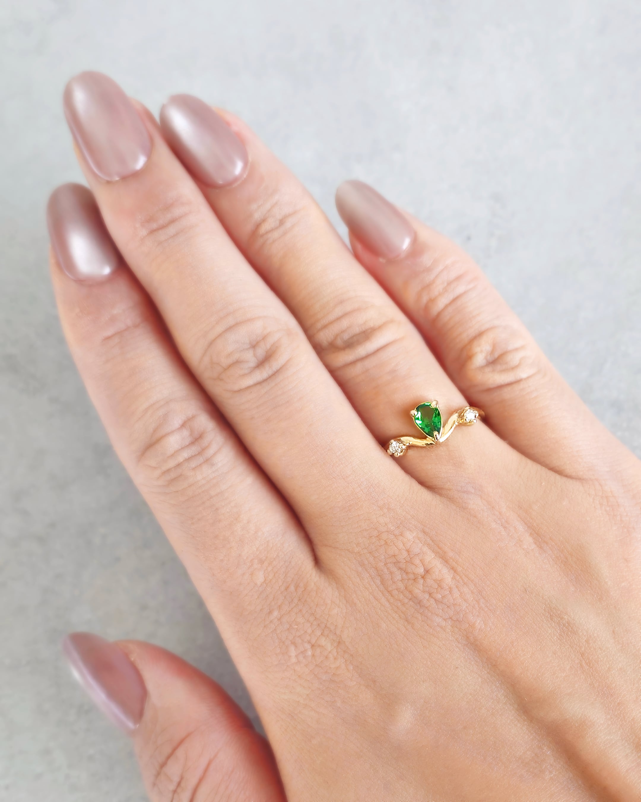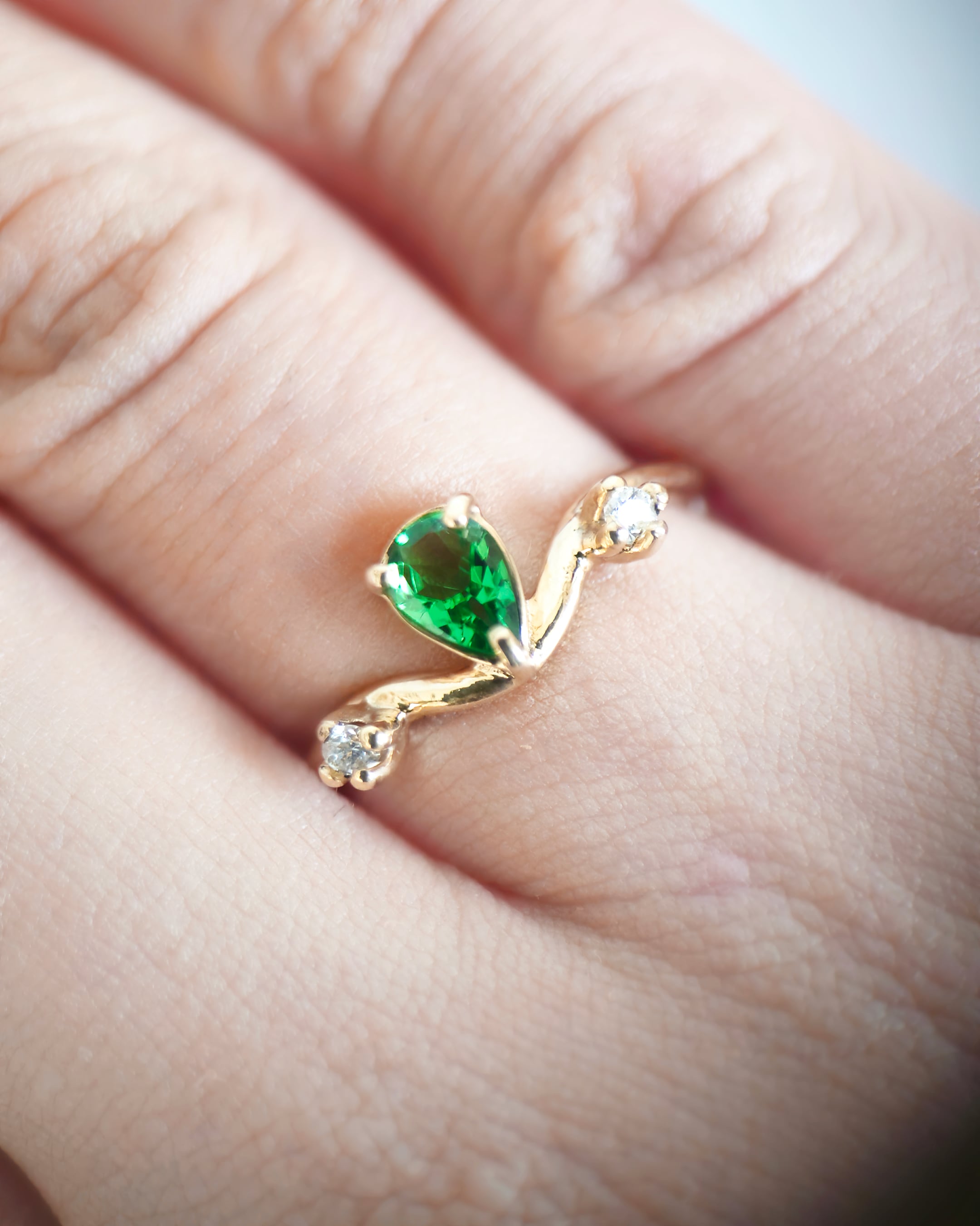 ツァボライト & ダイヤモンド V字ライン リング|K10ゴールド |ハンドメイド | 新緑 一点もの 天然石ジュエリー