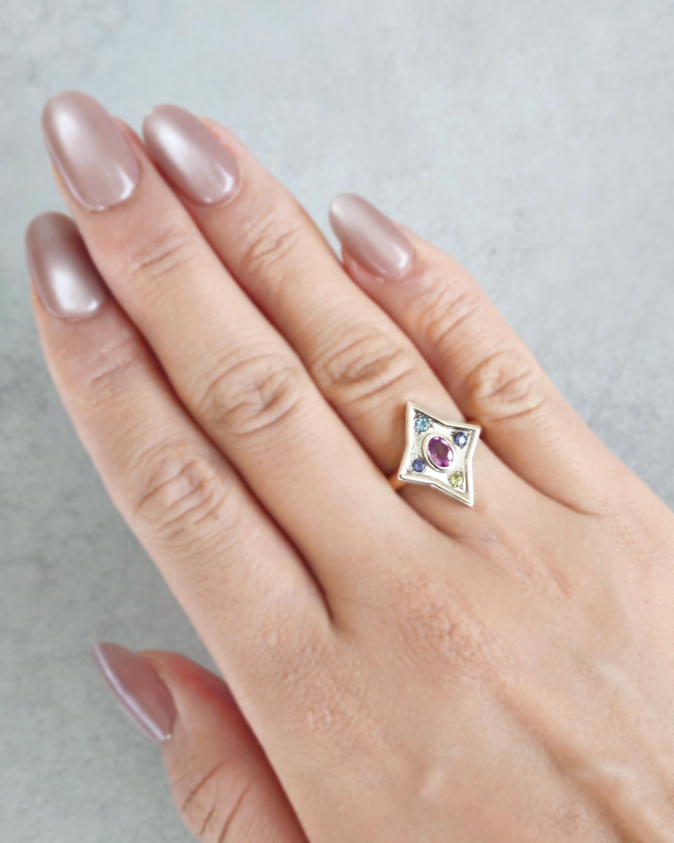 サファイア マルチカラー ジオメトリーリング|ピンクサファイア|Silver925×K10 ハンドメイド|紫陽花 初夏 一点もの 天然石ジュエリー